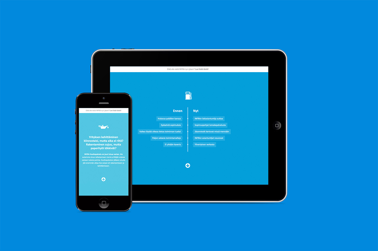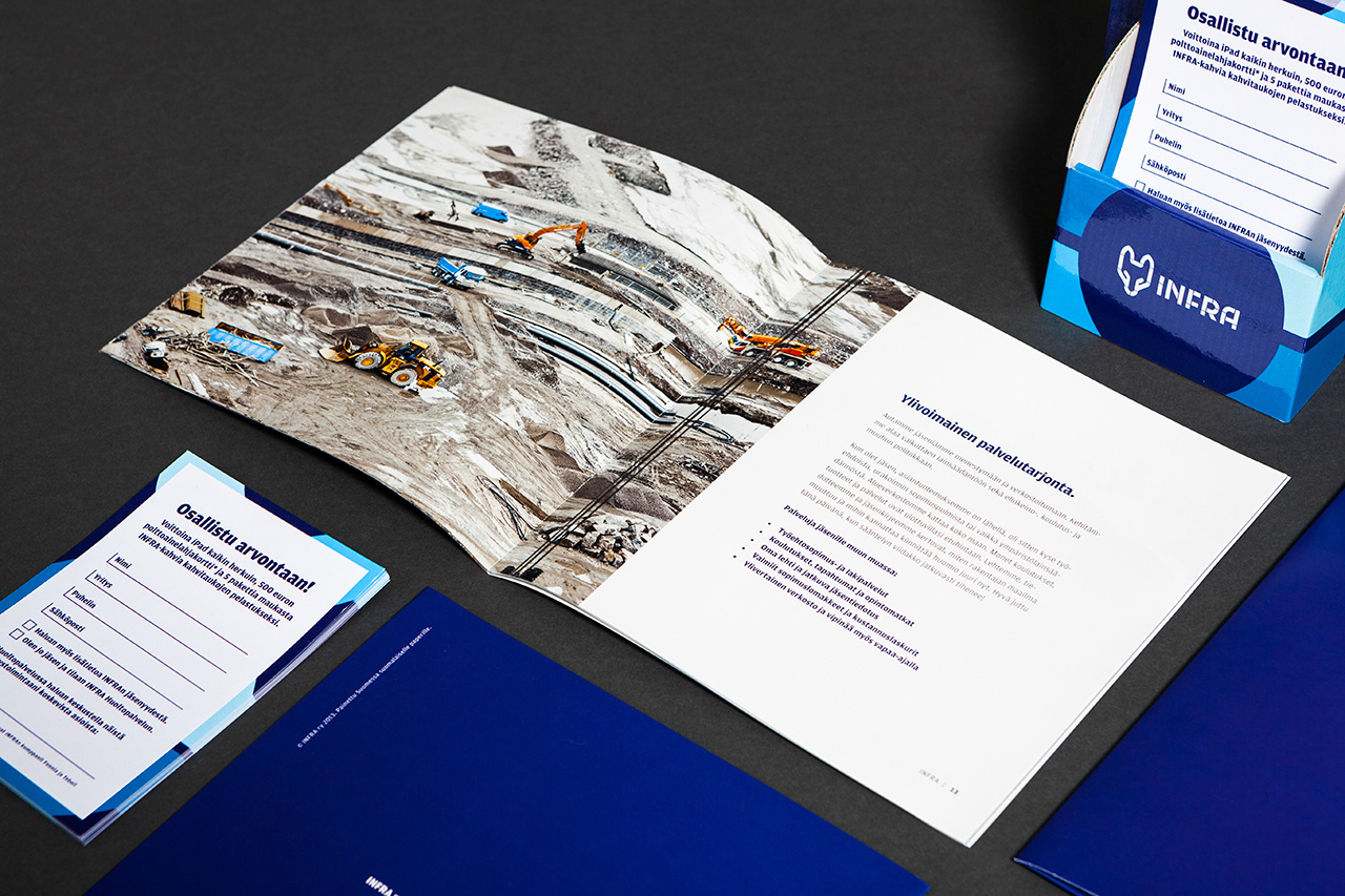 Infra on toimiala- ja työnantajajärjestö, jonka jäsenyritykset rakentavat ja pitävät kunnossa väyliä, terminaaleja ja elintärkeitä teknisiä verkostoja, joissa kulkee vesi, lämpö, sähkö ja tieto. Suunnittelimme Infralle markkinointikampanjan ja ulkona käytettävän messuosaston. Työhön sisältyi konseptointi, graafinen suunnittelu ja toteutuksen hallinnointi.